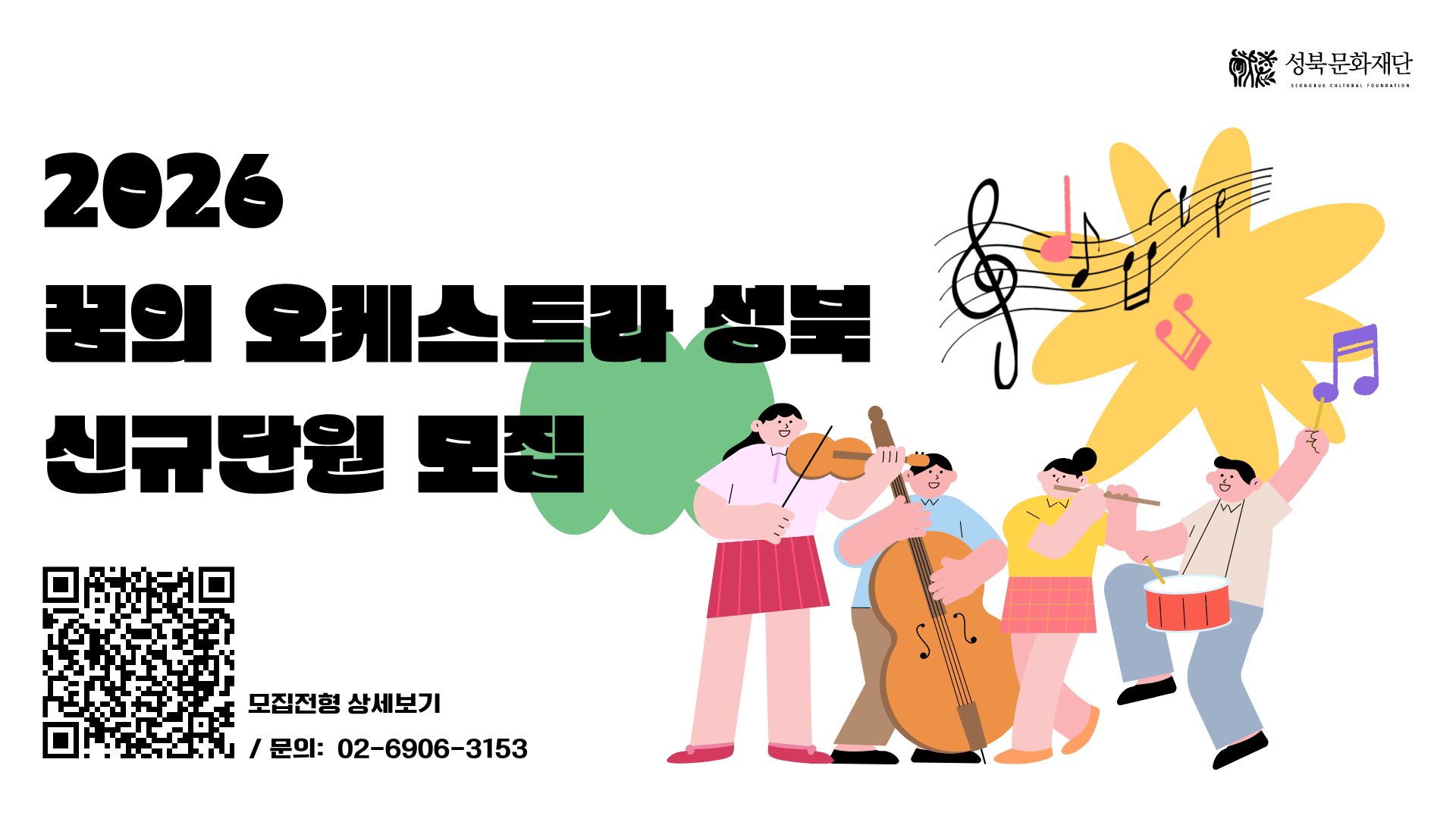 지역나눔 연주활동과 정기연주회 등 음악을 통해 지역과 소통하는 기회를 만들고 있는 아동·청소년 오케스트라 '꿈의 오케스트라 성북'의 2026년 신규단원 모집에 많은 관심과 참여 바랍니다.